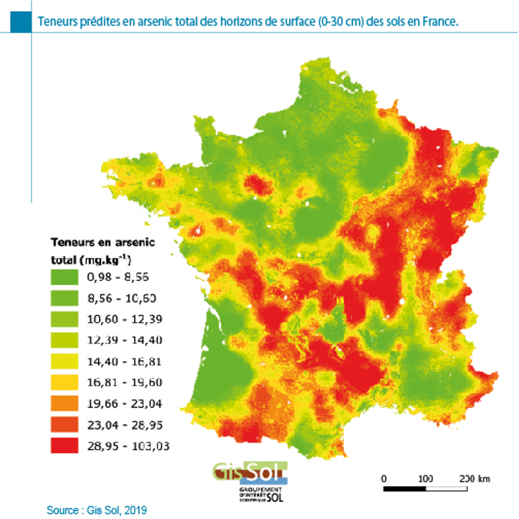 - Quand la concentration d’arsenic bioaccessible dans le sol dépasse 25 mg d’arsenic par kg de terre, il existe un risque que les personnes qui résident à cet endroit s’en imprègne en avalant ou en respirant des particules issues du sol. En France, plusieurs régions sont concernées par la présence d’une concentration importante d’arsenic dans le sous-sol : le Massif Central, l’Auvergne, les Vosges et les Alpes. Le Gis Sol (Groupement d’Intérêt Scientifique sur les Sols) a cartographié la teneur en arsenic des sols en France.